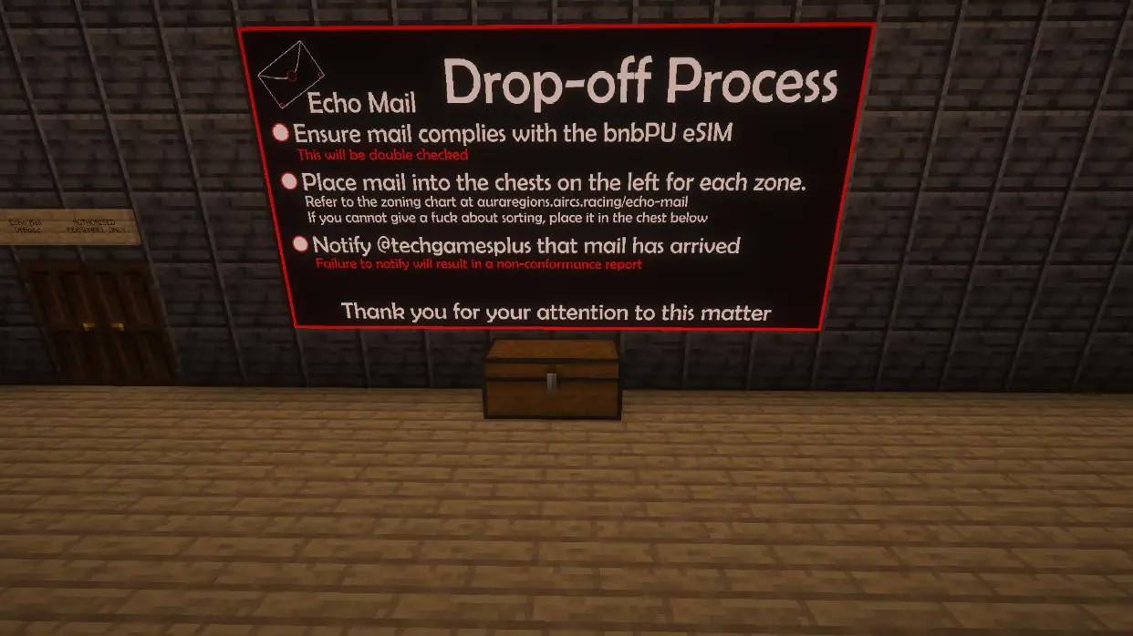 Mail that has originated from the Aura Regions and is to be sent to TAY (thePost) shall be placed in the left-hand side chests within the "Domestic" zone (labelled as "1").